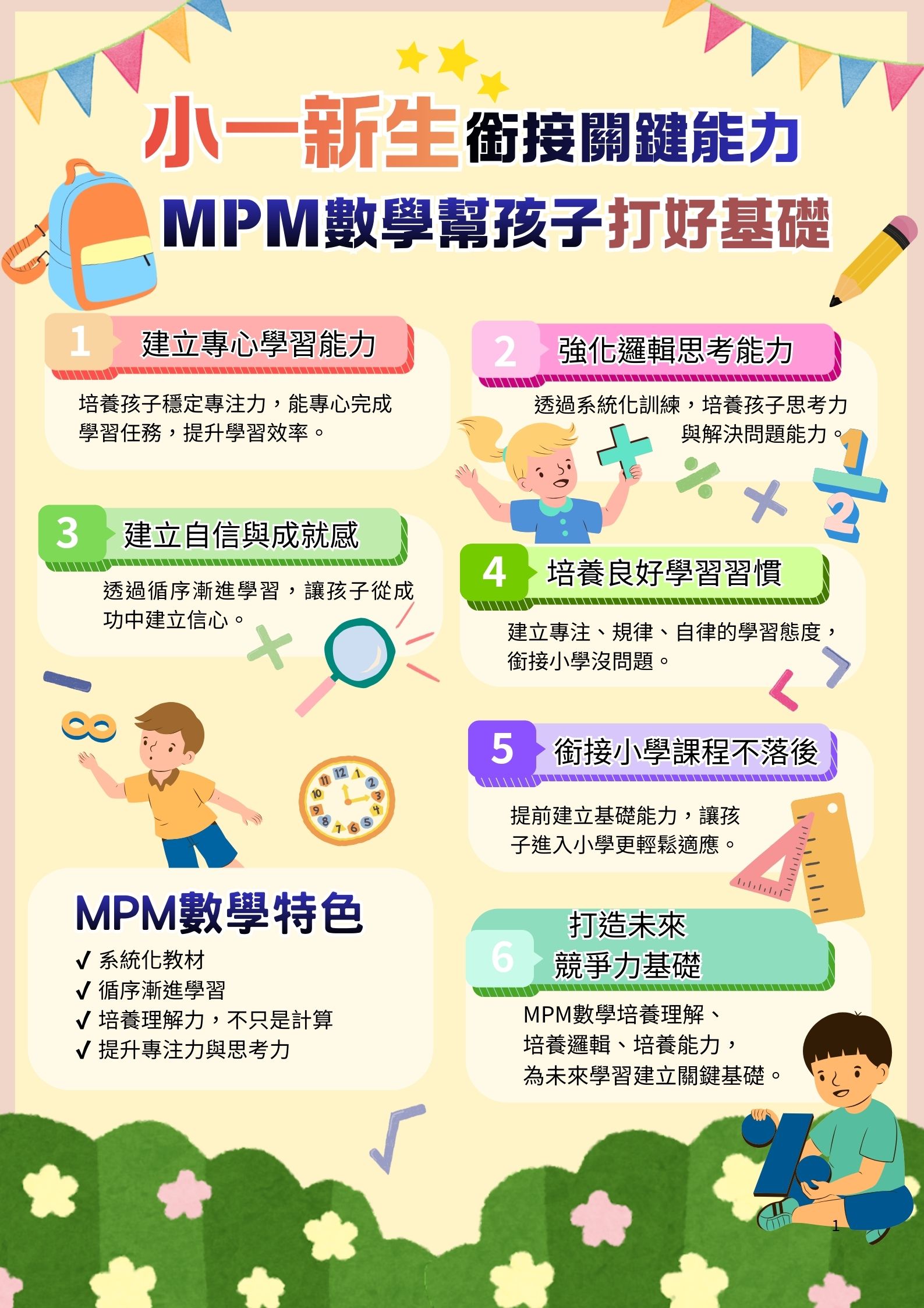 提前做好準備,讓孩子面對小學課程更有自信、不慌張,穩定成長。現在正是培養能力的最佳時機,歡迎加入MPM數學,為孩子打造扎實未來!
